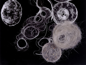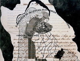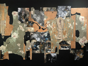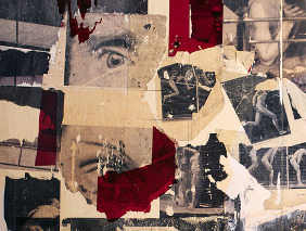 The word rebus, which meaning includes terms like enigma, puzzle, and riddle, comes from the Latin "res," thing, and is defined as "a sort of puzzle constructed with words, images, or symbols whose names sound like the parts of syllables from a word or phrase. The works are clearly not a literal rebus, but rather a sophisticated divertimento, a complex display of memorabilia in the form of a photograph-based quasi installation series that incorporates fragments from visual archives, drawings, cords, metal threads, and industrial patterns to construct three-dimensional pieces that reflect the progression of a unique and formal development process.